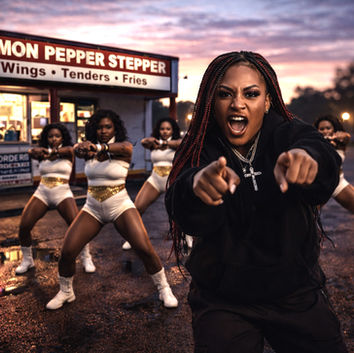 Camera is handheld — energetic, slightly documentary-style. Before the cashier repeats the order, the instrumental begins to shift. The receipt starts printing. INSERT: Receipt tearing — TITLE SLATE: “LEMON PEPPER STEPPER.” We push in on the cashier’s eyes — and transition. The bass drops. We punch into a stylized fantasy. The parking lot subtly transforms. Lighting heightens. Saturation increases. The asphalt becomes their stage.